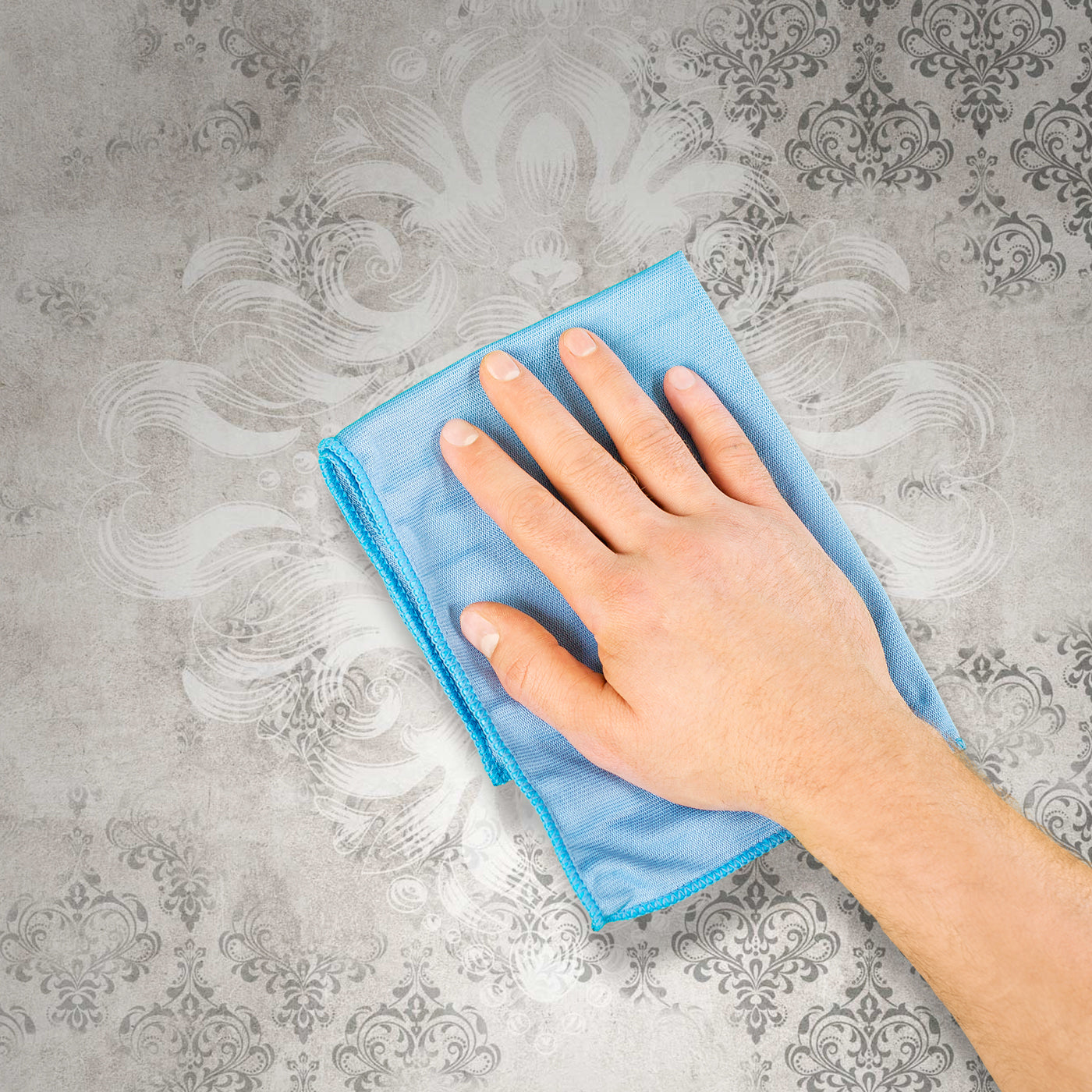 - Reinige eventuelle Verschmutzungen oder Kleberreste sofort mit einem feuchten Schwamm oder Tuch.