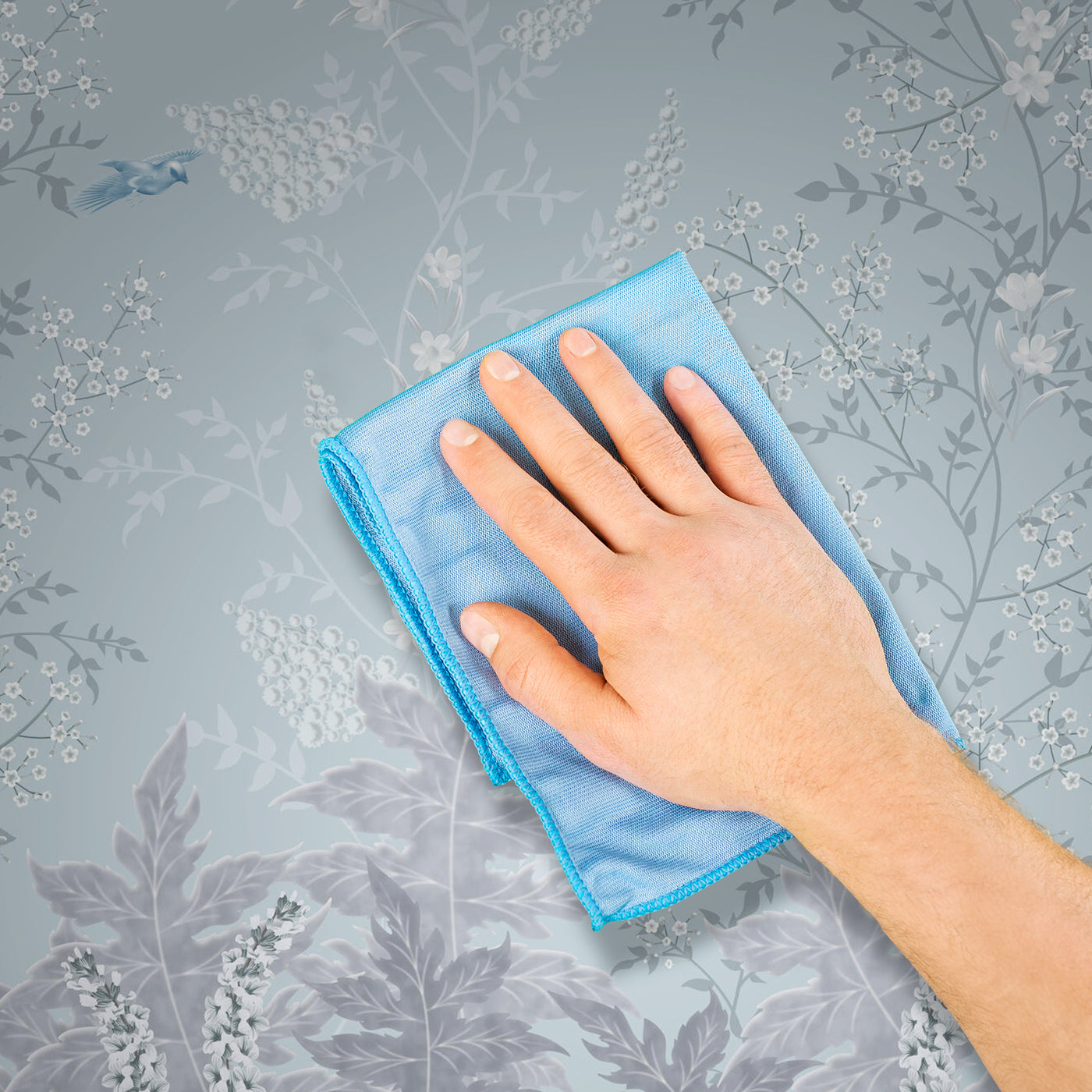 - Reinige eventuelle Verschmutzungen oder Kleberreste sofort mit einem feuchten Schwamm oder Tuch.