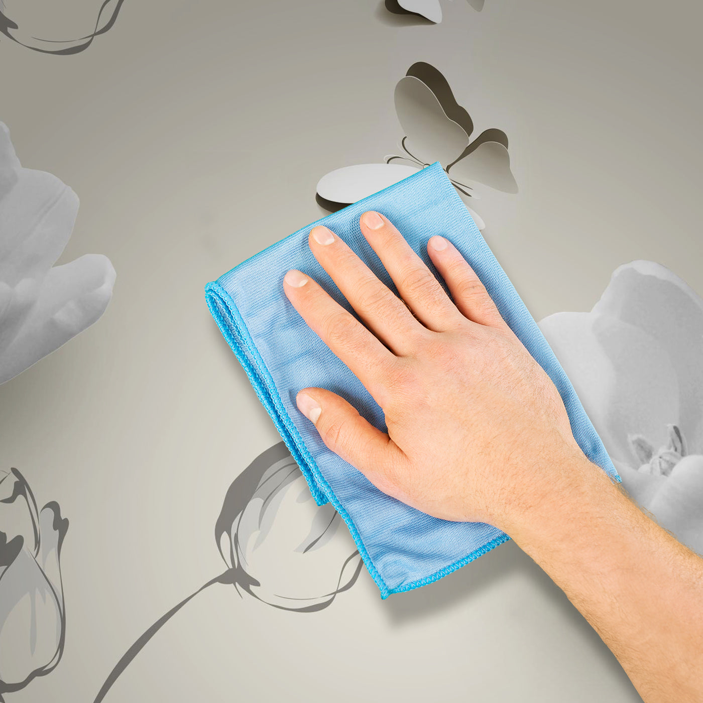 - Reinige eventuelle Verschmutzungen oder Kleberreste sofort mit einem feuchten Schwamm oder Tuch.