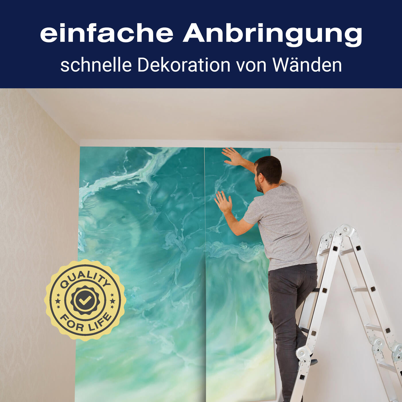 - Wenn deine Fototapete aus mehreren Bahnen besteht, achte darauf, dass die Motive oder das Design sauber und nahtlos ineinander übergehen. Achte dabei auf die Anweisungen des Herstellers oder auf eventuelle Markierungen auf der Tapete selbst.