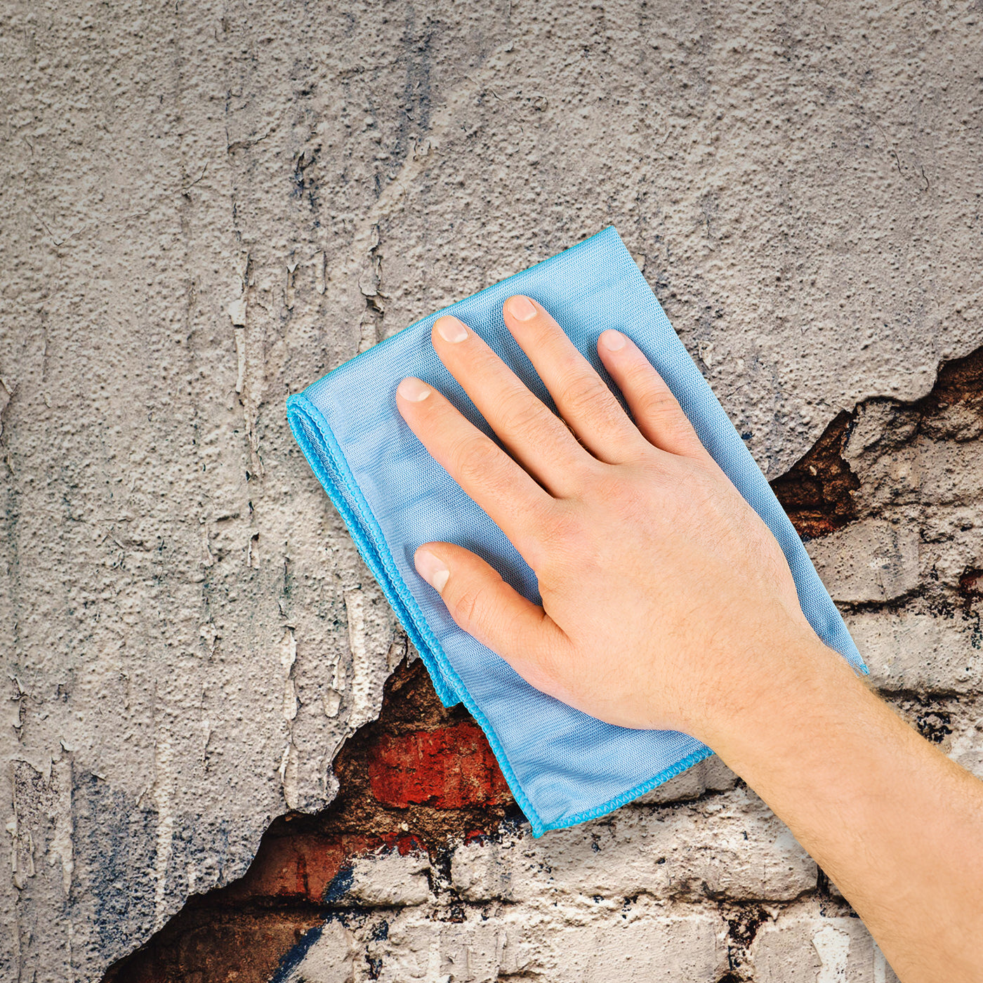 - Stelle sicher, dass die Wand sauber, glatt und trocken ist. Entferne alte Tapetenreste oder Unebenheiten und spachtele gegebenenfalls Löcher oder Risse in der Wand aus.