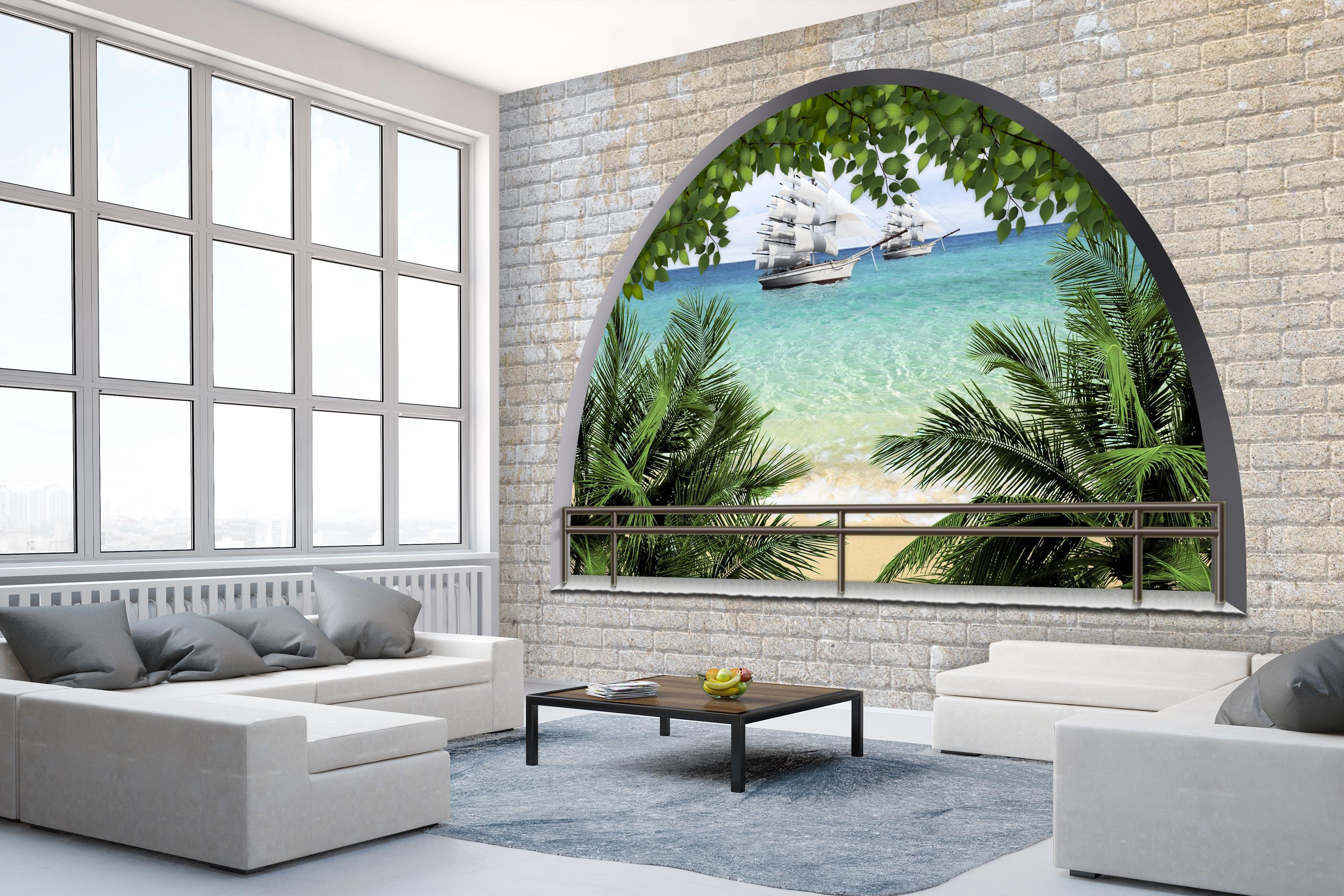 FOTOTAPETE Ziegelmauer Meer Palmen