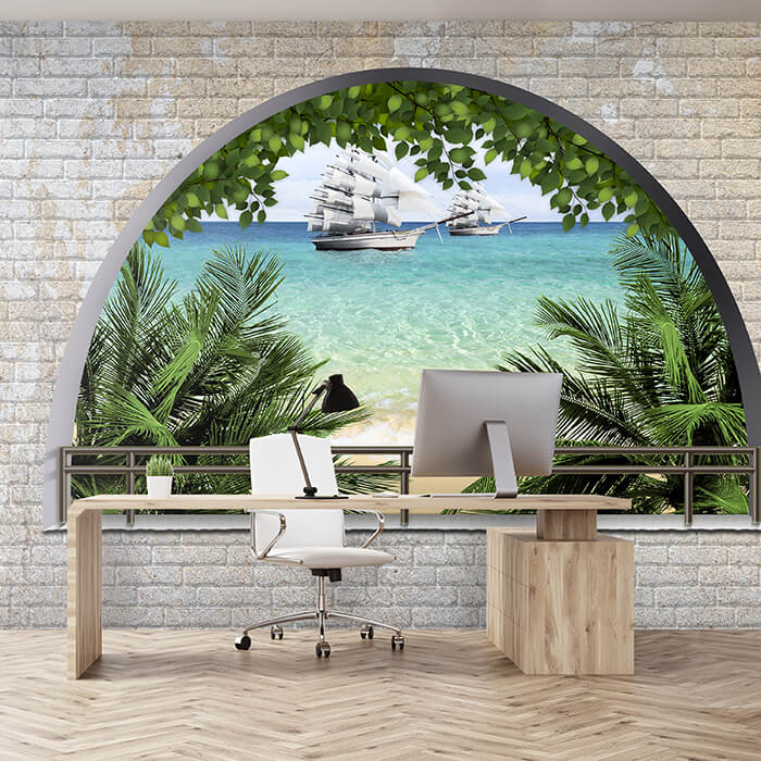 Fototapete Ziegelmauer Meer Palmen M1270