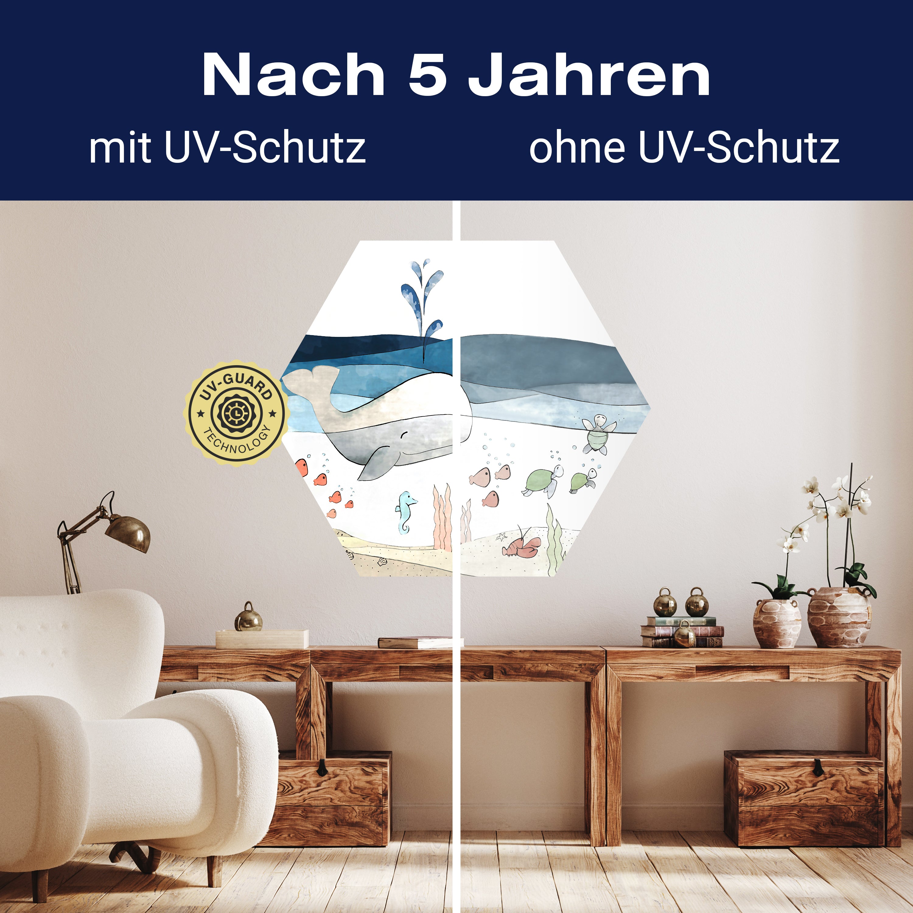 Setze auf die UV-Guard-Technologie, um deine selbstklebenden Panorama-Fototapeten nicht nur atemberaubend, sondern auch dauerhaft strahlend zu gestalten. Dieser fortschrittliche UV-Schutz sorgt dafür, dass die lebhaften Farben und scharfen Details deiner Wandgestaltung gegen die bleichende Wirkung der Sonnenstrahlen geschützt sind. Egal, wie intensiv das Sonnenlicht ist, die UV-Guard-Technologie bewahrt die Brillanz und Tiefe deiner Bilder, sodass sie jahrelang wie neu aussehen. Mach dir keine Sorgen mehr über verblassende Farben oder den Verlust von Detailreichtum. Mit dieser Technologie investierst du in die Langlebigkeit und Schönheit deiner Räume. Steige jetzt um auf UV-Guard und genieße ungetrübte Farbenpracht bei jedem Licht.