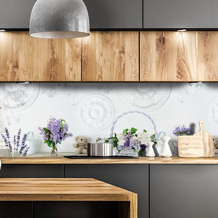 Küchenrückwand Flieder Lila Korb Bücher Stuck Weiß M1210