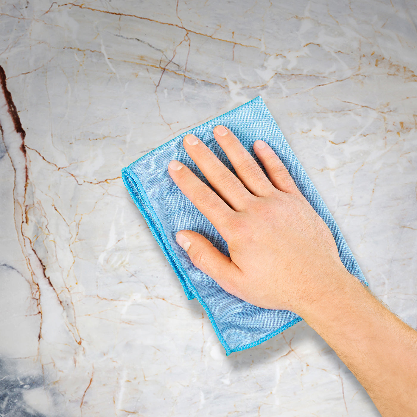 - Reinige die Oberfläche mit einem milden Reinigungsmittel oder einer Lösung aus warmem Wasser und Spülmittel.