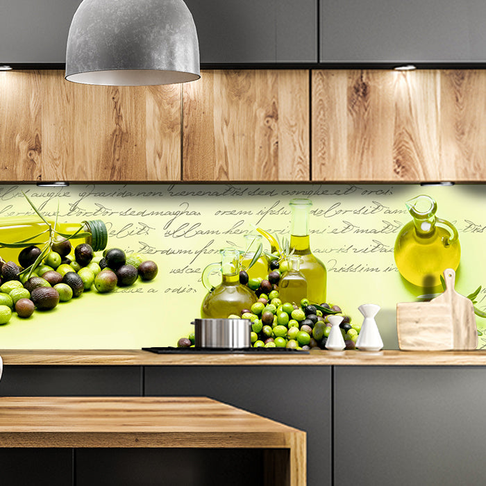 Küchenrückwand Oliven Öl Schrift Grün Flasche Glas M1157