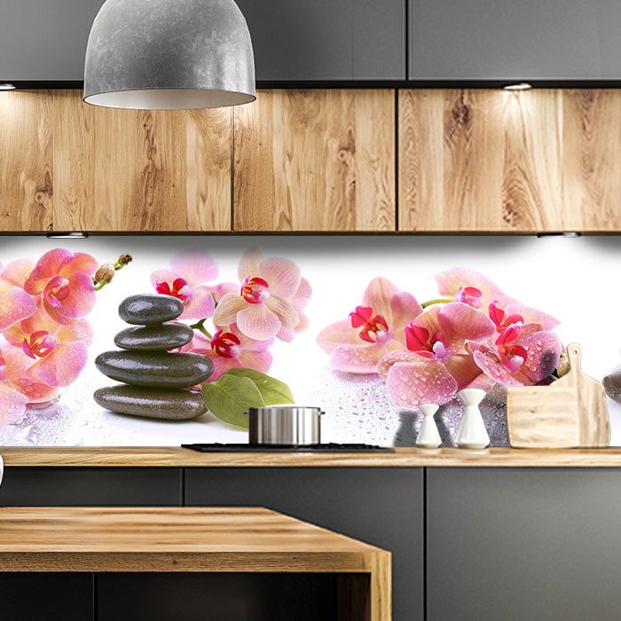 Bist Du es leid, auf die langweiligen, schwer zu reinigende Fliesen in Deiner Küche zu schauen? Stell Dir vor, wie Deine Küche mit einer stilvollen, modernen Rückwand zum Leben erwacht! Unsere Küchenrückwand 'Orchidee Blätter Steine Wasser' ist nicht nur ein optisches Highlight, sondern auch praktisch und pflegeleicht.