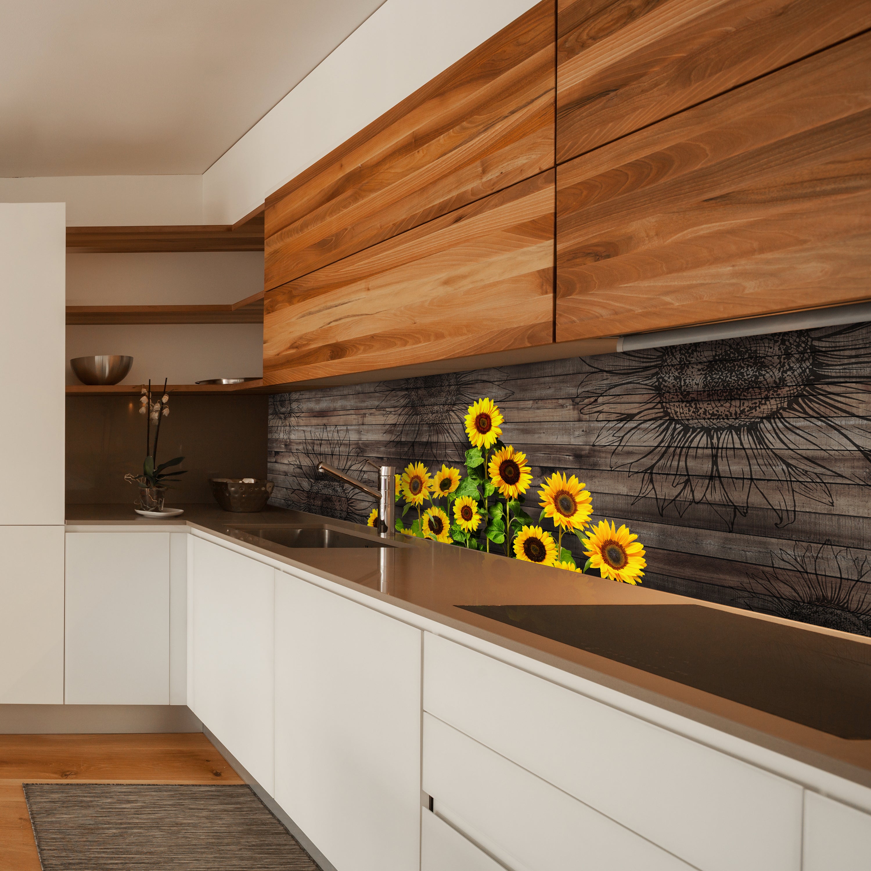 Bist Du es leid, auf die langweiligen, schwer zu reinigende Fliesen in Deiner Küche zu schauen? Stell Dir vor, wie Deine Küche mit einer stilvollen, modernen Rückwand zum Leben erwacht! Unsere Küchenrückwand 'Sonnenblumen, Holz' ist nicht nur ein optisches Highlight, sondern auch praktisch und pflegeleicht.
