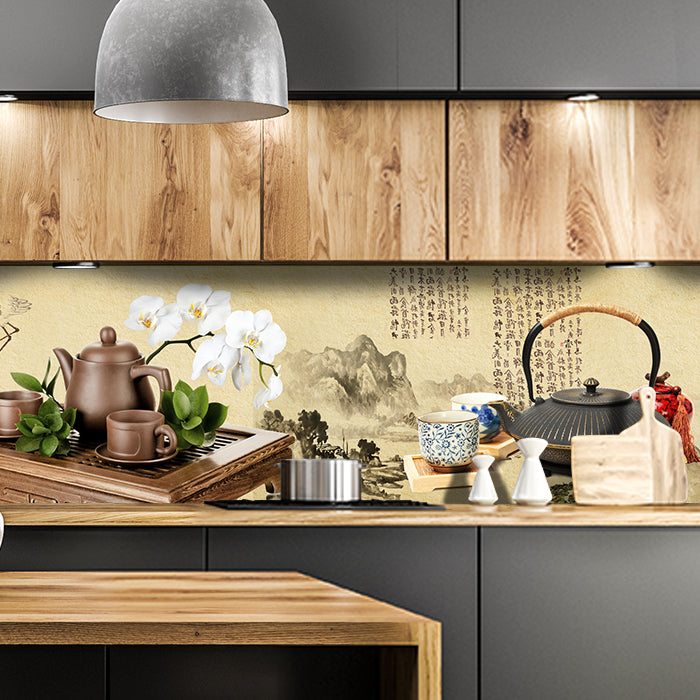 Küchenrückwand Tee Asiatisch Kirschblüte Holz Pergament M1145