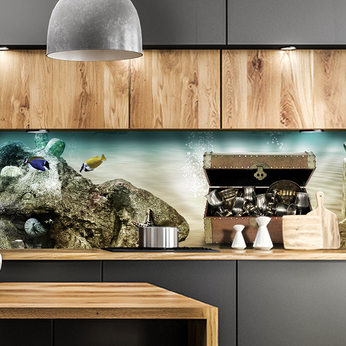 Bist Du es leid, auf die langweiligen, schwer zu reinigende Fliesen in Deiner Küche zu schauen? Stell Dir vor, wie Deine Küche mit einer stilvollen, modernen Rückwand zum Leben erwacht! Unsere Küchenrückwand 'Unterwasserschatz' ist nicht nur ein optisches Highlight, sondern auch praktisch und pflegeleicht.