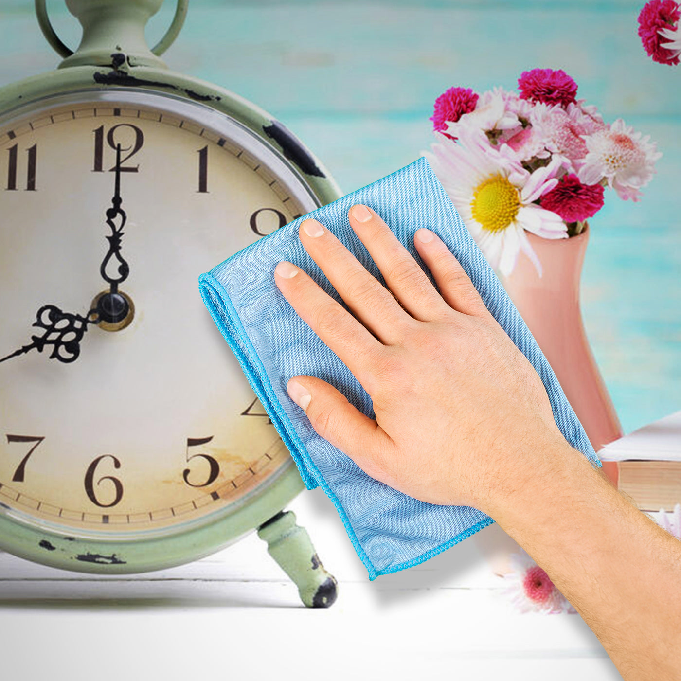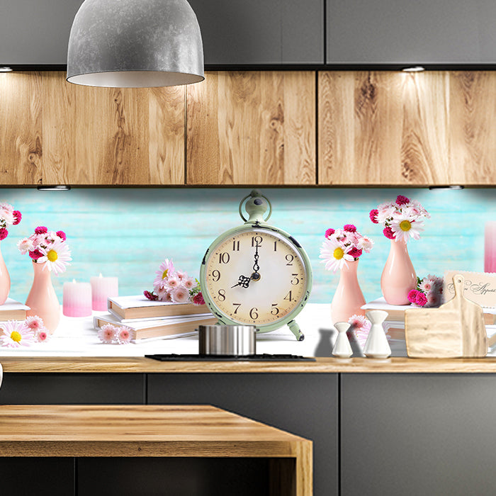 Küchenrückwand Wecker Uhr Blumen Vasen Blüten Bücher M1246