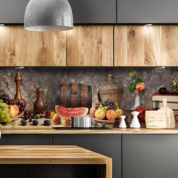Bist Du es leid, auf die langweiligen, schwer zu reinigende Fliesen in Deiner Küche zu schauen? Stell Dir vor, wie Deine Küche mit einer stilvollen, modernen Rückwand zum Leben erwacht! Unsere Küchenrückwand 'Wein Obst Früchte Tafel Melone Pfirsisch' ist nicht nur ein optisches Highlight, sondern auch praktisch und pflegeleicht.