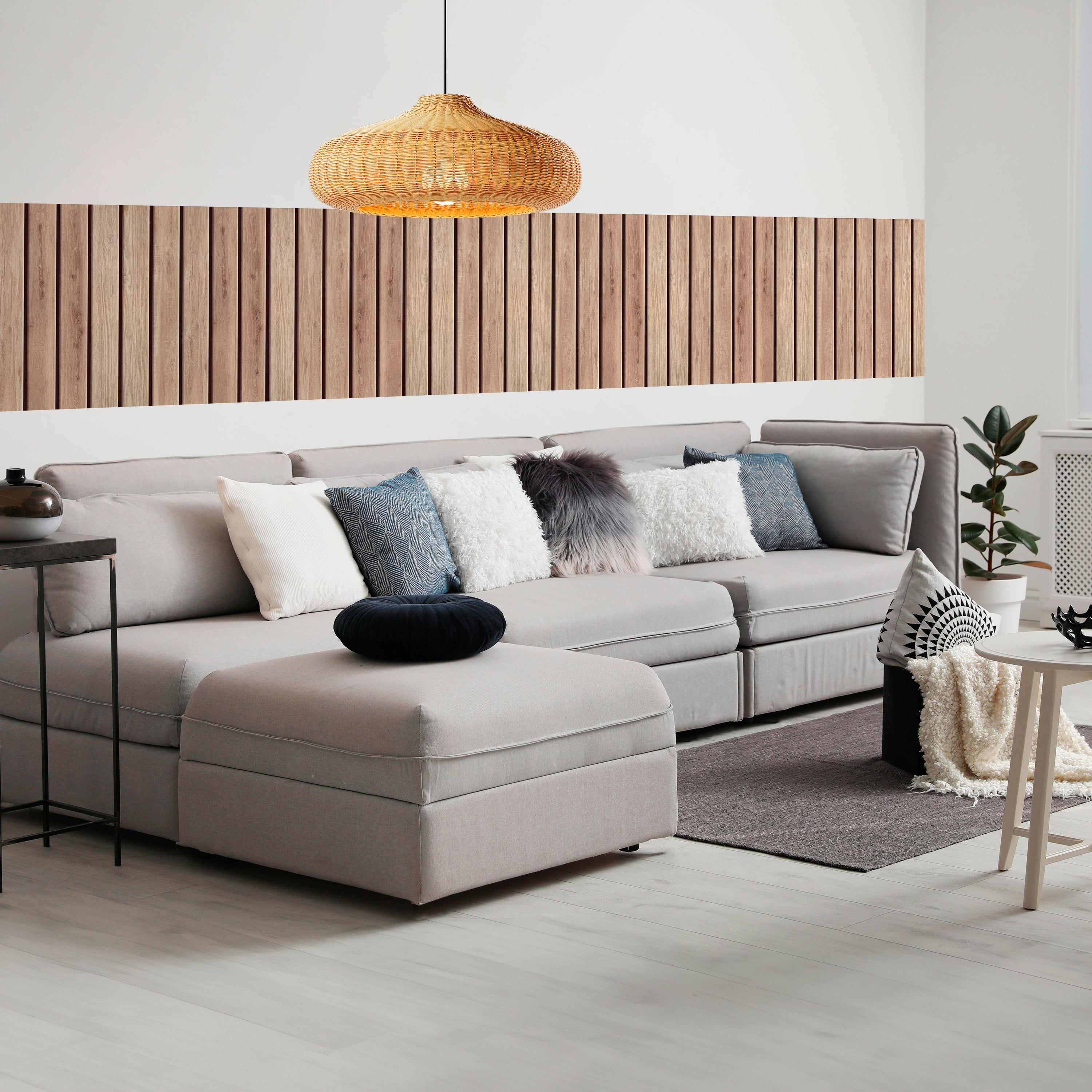 - Miss die Höhe und Breite der Wand und schneide die selbstklebende Vliestapete entsprechend zu. Lasse dabei an allen Rändern einen kleinen Überstand von etwa 5 cm, um genug Spielraum für die genaue Anpassung zu haben.