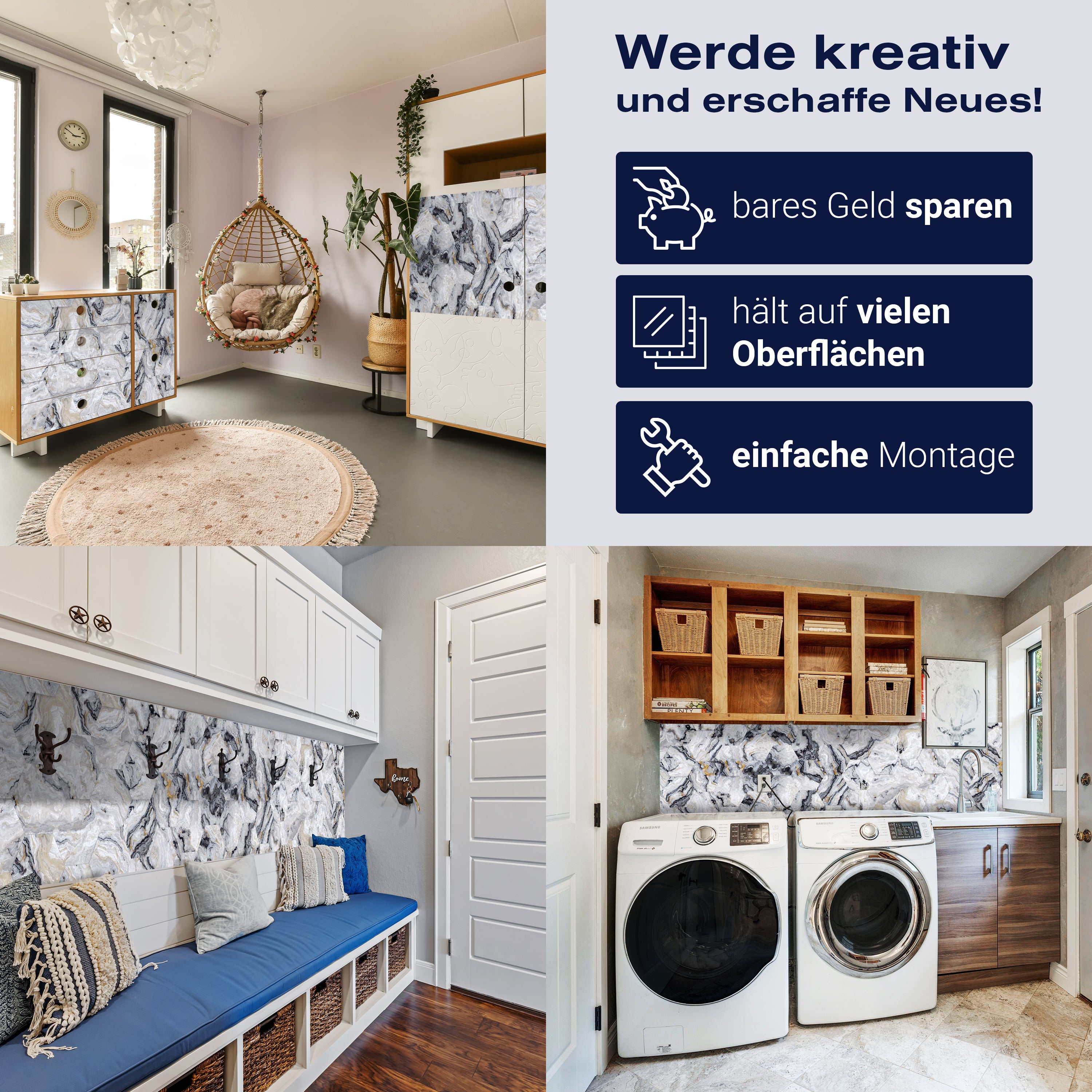 - Selbstklebendes Vlies 150g/m²: Einfach anzubringen, perfekt für Mietwohnungen.