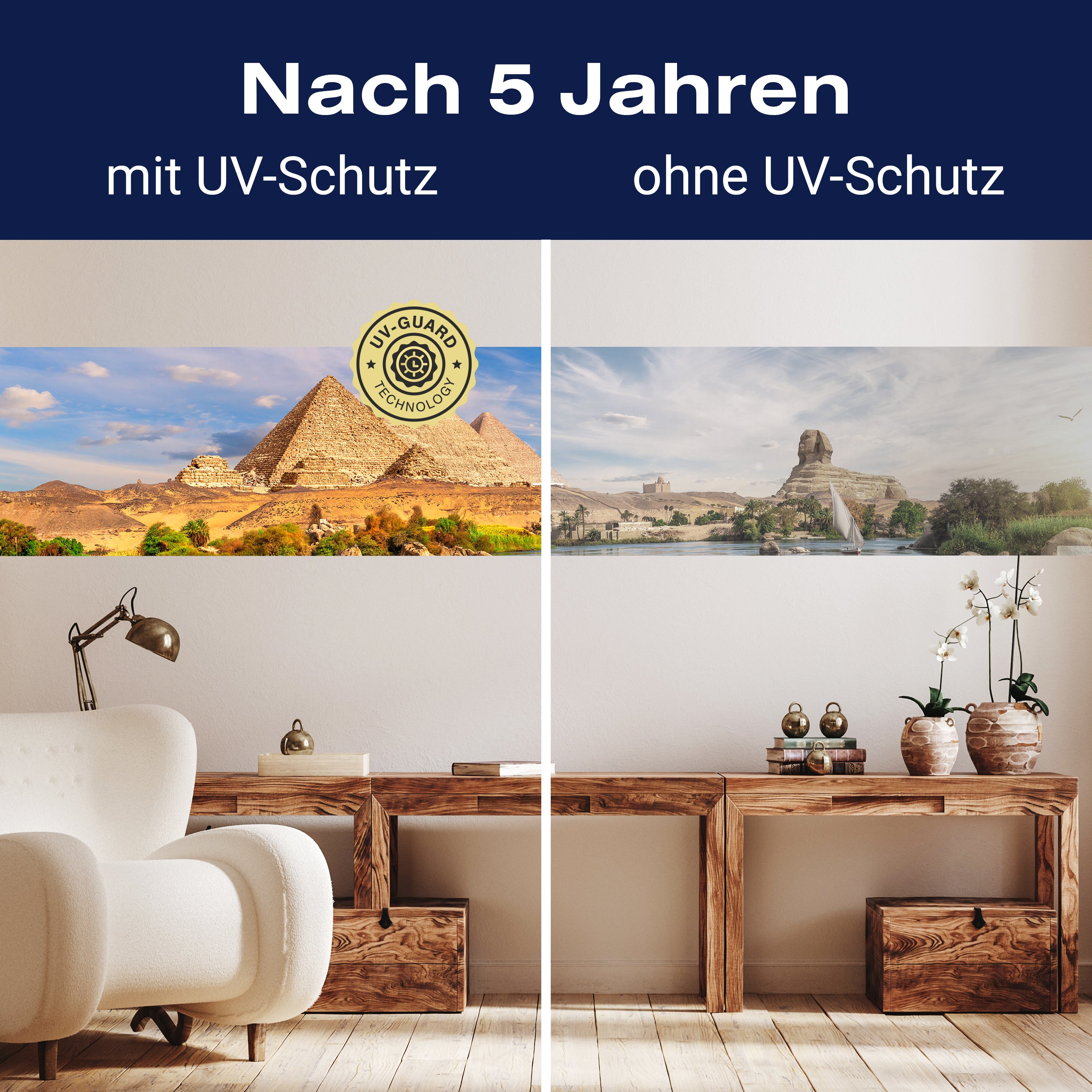 Setze auf die UV-Guard-Technologie, um deine selbstklebenden Panorama-Fototapeten nicht nur atemberaubend, sondern auch dauerhaft strahlend zu gestalten. Dieser fortschrittliche UV-Schutz sorgt dafür, dass die lebhaften Farben und scharfen Details deiner Wandgestaltung gegen die bleichende Wirkung der Sonnenstrahlen geschützt sind. Egal, wie intensiv das Sonnenlicht ist, die UV-Guard-Technologie bewahrt die Brillanz und Tiefe deiner Bilder, sodass sie jahrelang wie neu aussehen. Mach dir keine Sorgen mehr über verblassende Farben oder den Verlust von Detailreichtum. Mit dieser Technologie investierst du in die Langlebigkeit und Schönheit deiner Räume. Steige jetzt um auf UV-Guard und genieße ungetrübte Farbenpracht bei jedem Licht.