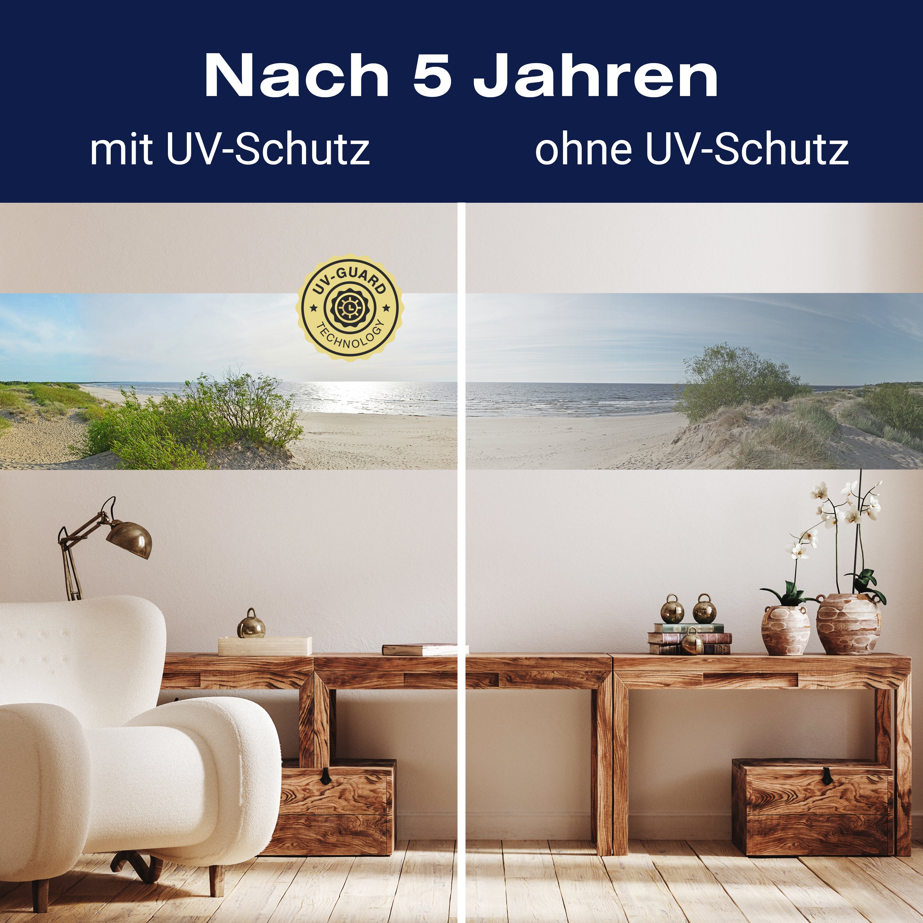 Setze auf die UV-Guard-Technologie, um deine selbstklebenden Panorama-Fototapeten nicht nur atemberaubend, sondern auch dauerhaft strahlend zu gestalten. Dieser fortschrittliche UV-Schutz sorgt dafür, dass die lebhaften Farben und scharfen Details deiner Wandgestaltung gegen die bleichende Wirkung der Sonnenstrahlen geschützt sind. Egal, wie intensiv das Sonnenlicht ist, die UV-Guard-Technologie bewahrt die Brillanz und Tiefe deiner Bilder, sodass sie jahrelang wie neu aussehen. Mach dir keine Sorgen mehr über verblassende Farben oder den Verlust von Detailreichtum. Mit dieser Technologie investierst du in die Langlebigkeit und Schönheit deiner Räume. Steige jetzt um auf UV-Guard und genieße ungetrübte Farbenpracht bei jedem Licht.