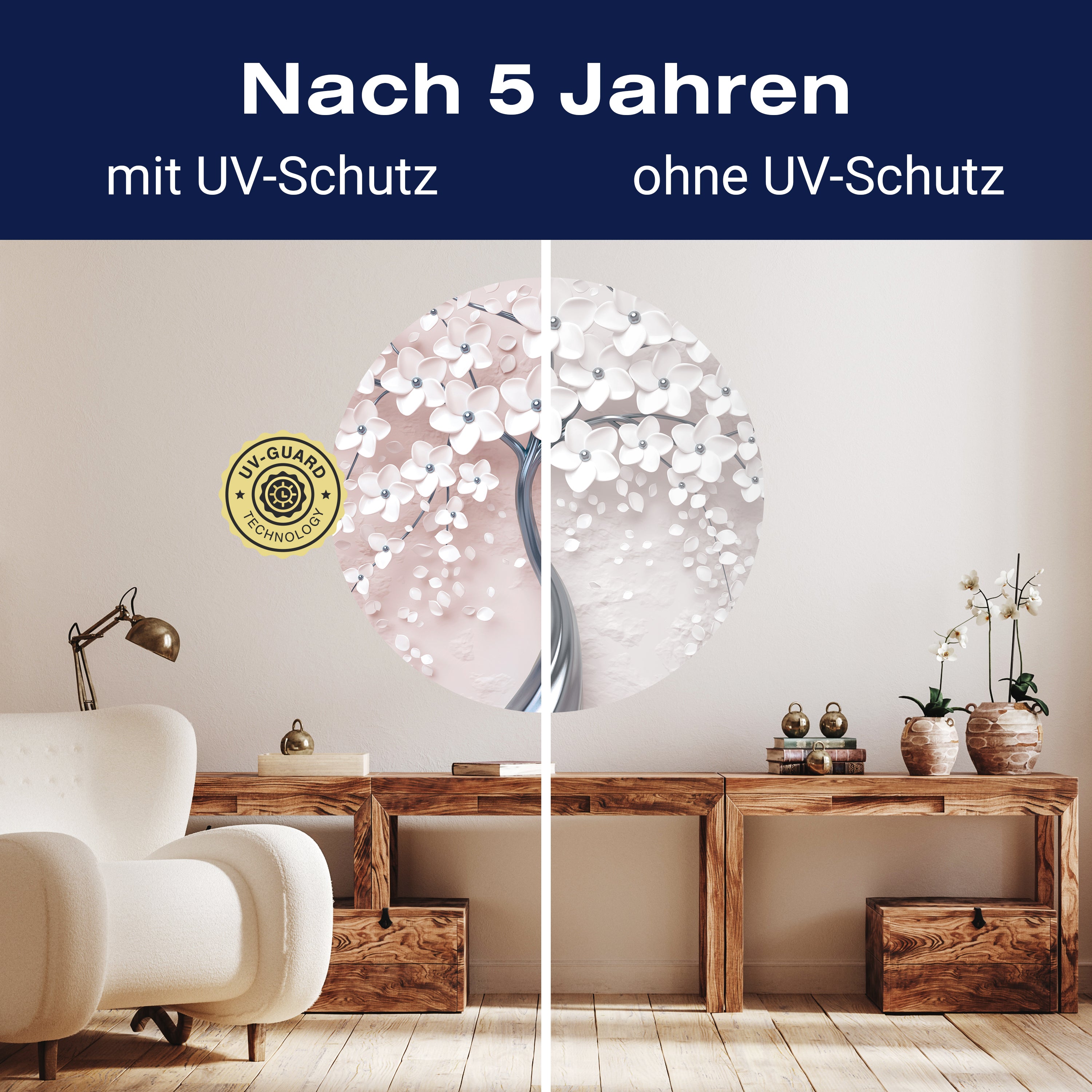 Setze auf die UV-Guard-Technologie, um deine selbstklebenden Panorama-Fototapeten nicht nur atemberaubend, sondern auch dauerhaft strahlend zu gestalten. Dieser fortschrittliche UV-Schutz sorgt dafür, dass die lebhaften Farben und scharfen Details deiner Wandgestaltung gegen die bleichende Wirkung der Sonnenstrahlen geschützt sind. Egal, wie intensiv das Sonnenlicht ist, die UV-Guard-Technologie bewahrt die Brillanz und Tiefe deiner Bilder, sodass sie jahrelang wie neu aussehen. Mach dir keine Sorgen mehr über verblassende Farben oder den Verlust von Detailreichtum. Mit dieser Technologie investierst du in die Langlebigkeit und Schönheit deiner Räume. Steige jetzt um auf UV-Guard und genieße ungetrübte Farbenpracht bei jedem Licht.