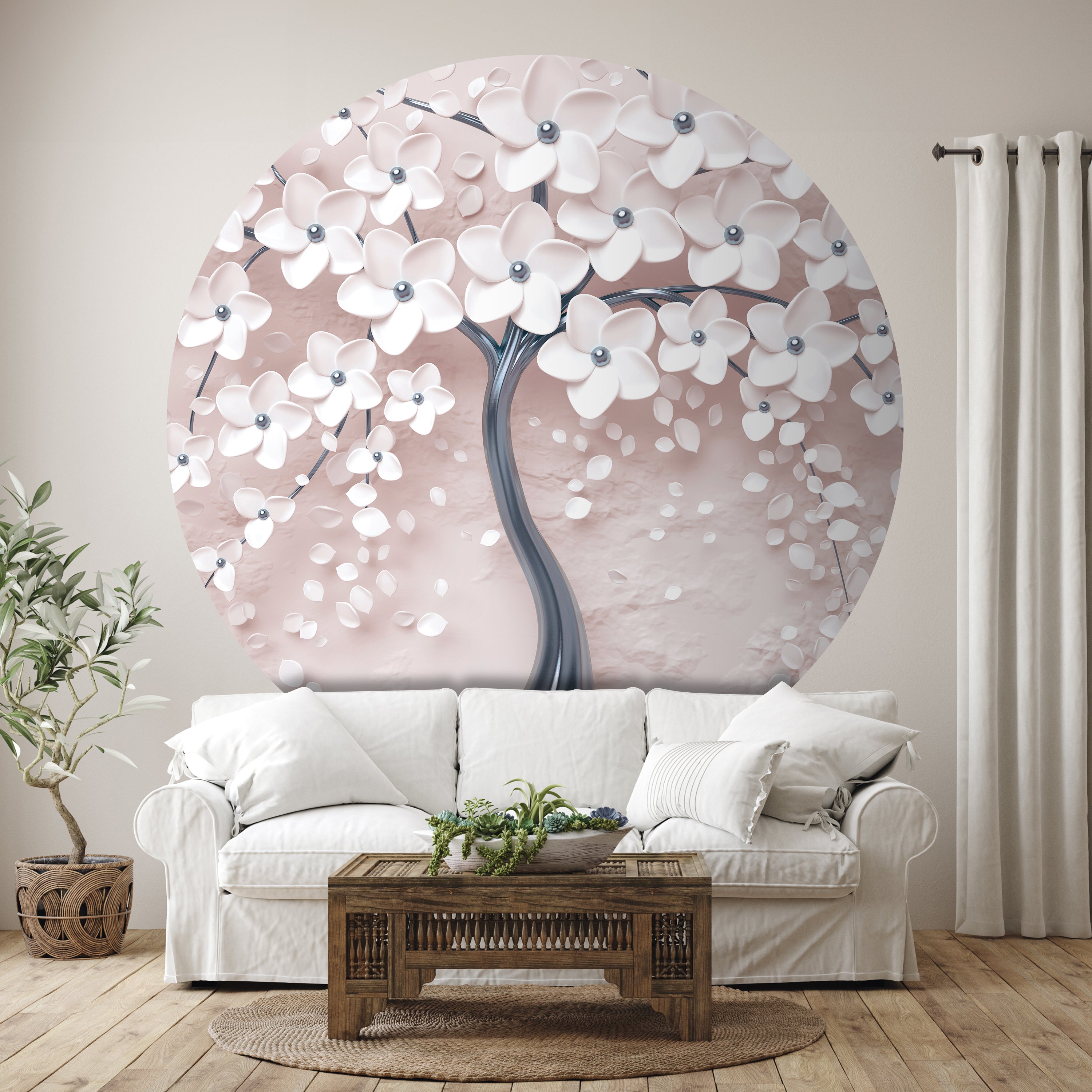 Träumst Du davon, Deine Wände in eine beeindruckende Kunstgalerie zu verwandeln? Mit unserer hochwertigen, runden Fototapete Baum mit Blüten M0019 ist es jetzt möglich! Jede Wand wird zu einer Leinwand Deiner Kreativität.