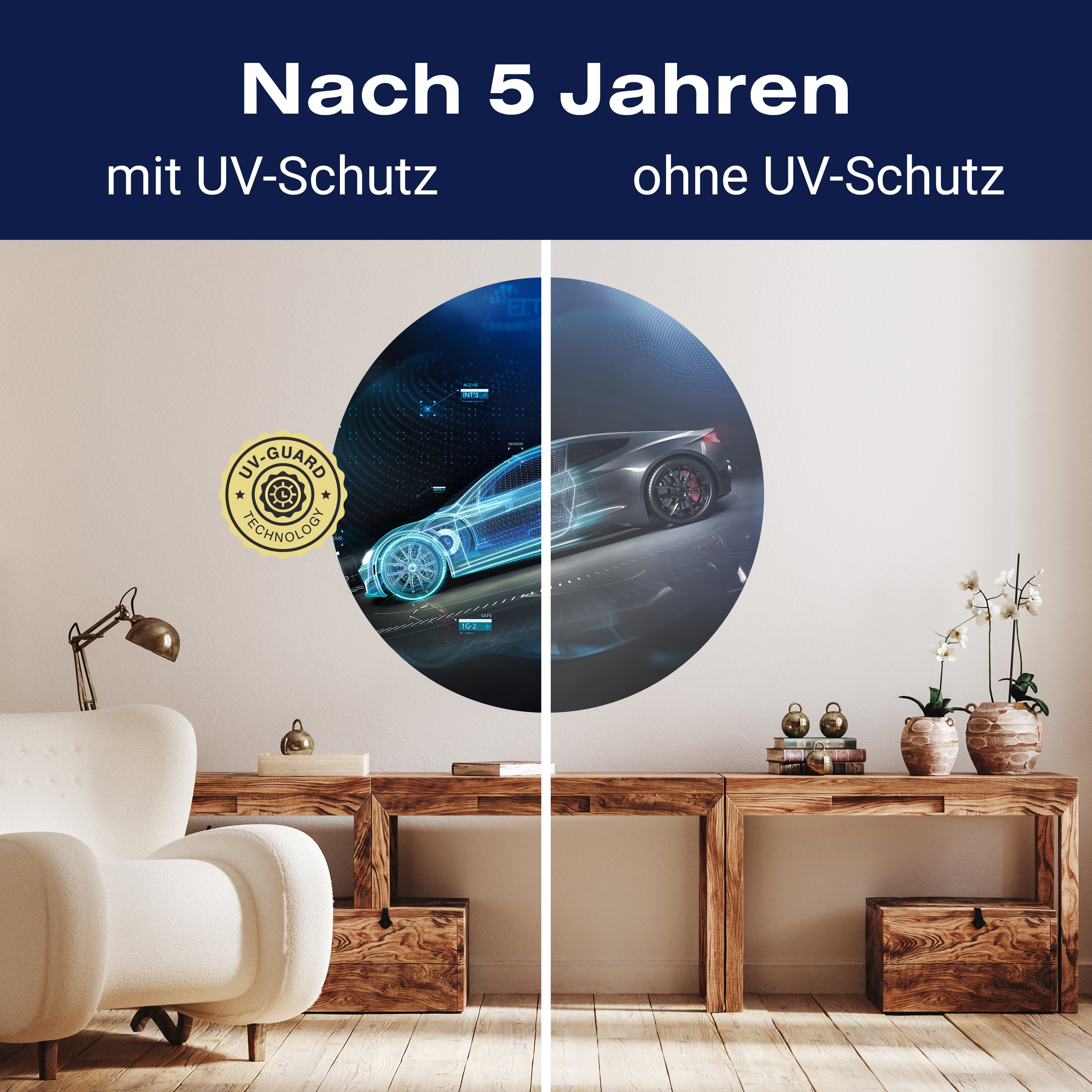 Setze auf die UV-Guard-Technologie, um deine selbstklebenden Panorama-Fototapeten nicht nur atemberaubend, sondern auch dauerhaft strahlend zu gestalten. Dieser fortschrittliche UV-Schutz sorgt dafür, dass die lebhaften Farben und scharfen Details deiner Wandgestaltung gegen die bleichende Wirkung der Sonnenstrahlen geschützt sind. Egal, wie intensiv das Sonnenlicht ist, die UV-Guard-Technologie bewahrt die Brillanz und Tiefe deiner Bilder, sodass sie jahrelang wie neu aussehen. Mach dir keine Sorgen mehr über verblassende Farben oder den Verlust von Detailreichtum. Mit dieser Technologie investierst du in die Langlebigkeit und Schönheit deiner Räume. Steige jetzt um auf UV-Guard und genieße ungetrübte Farbenpracht bei jedem Licht.