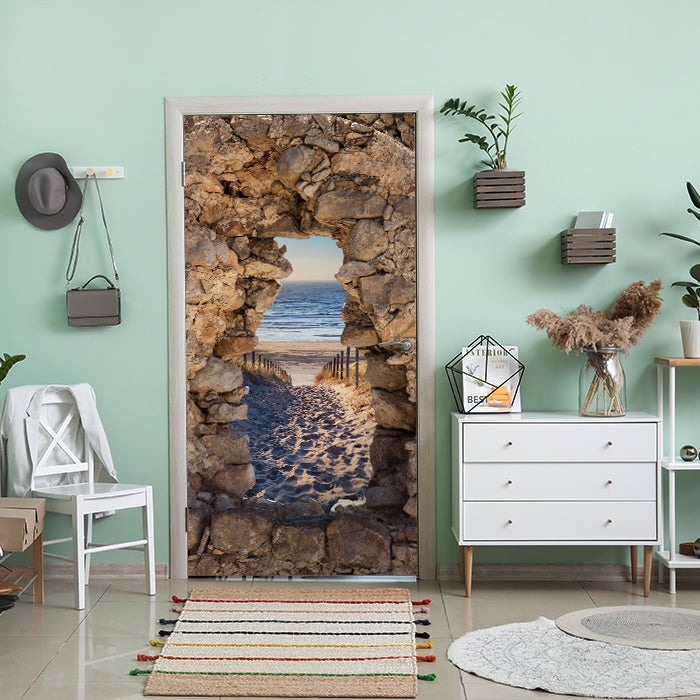 Entdecke die Türtapete 3D Steine, Weg zum Strand, Meer, Sand
