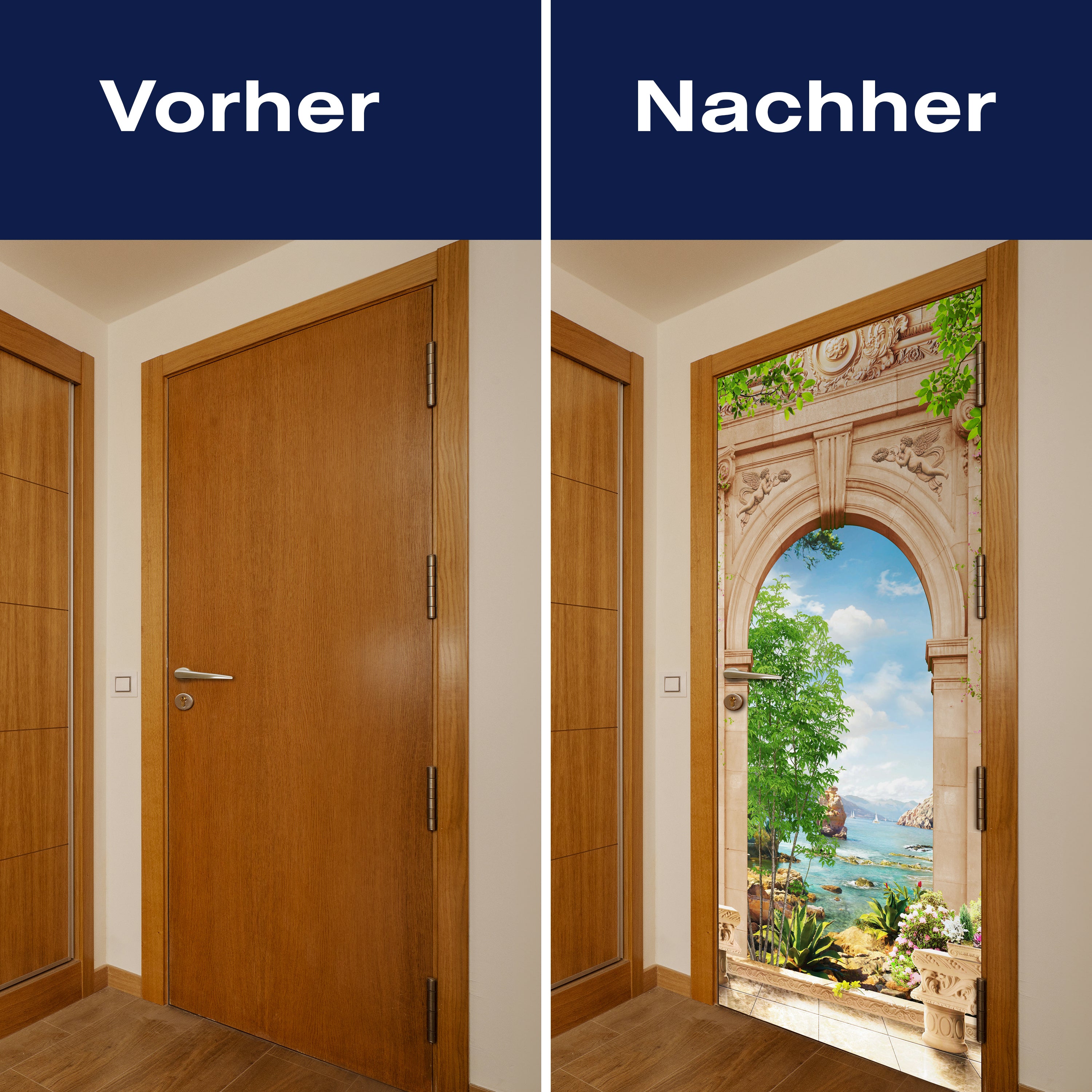Hast du jemals darüber nachgedacht, wie eine einfache Veränderung deinen Wohnraum komplett umgestalten kann? Die Türtapete Blick aufs Meer, Torbogen, Pflanzen von Wandmotiv24 ist genau das, was du brauchst, um deinem Zuhause einen Hauch von Einzigartigkeit und Stil zu verleihen. Dieses einzigartige Design erzielt eine atemberaubende visuelle Wirkung, die jeden Betrachter in den Bann zieht.
