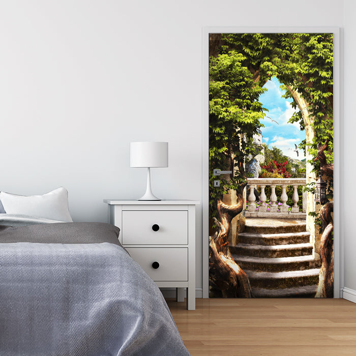 Entdecke die Türtapete Blick durch Tor, Efeu, Pflanzen, Vögel