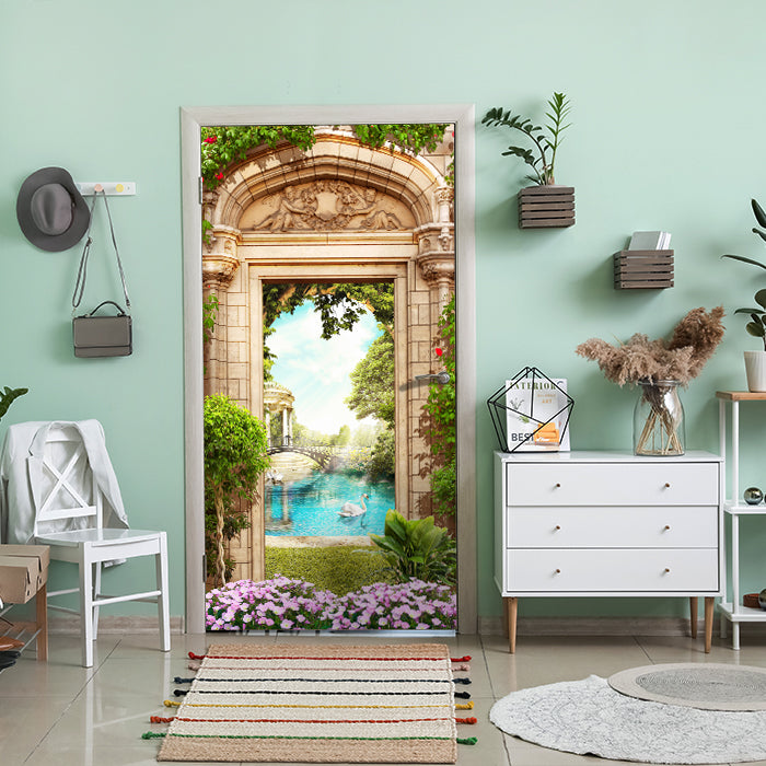 Entdecke die Türtapete Blick in Park, Schwan, Teich, Brücke