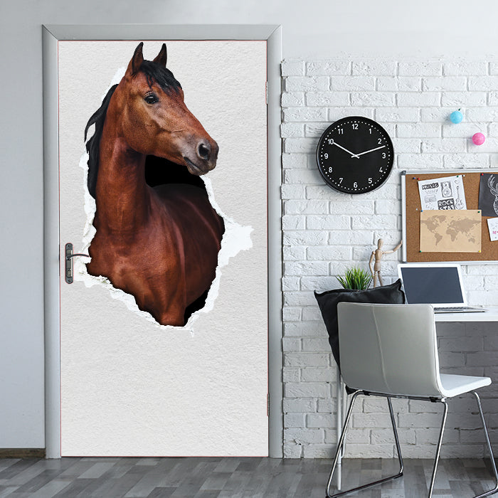 Entdecke die Türtapete braunes Pferd schaut durch Mauer, 3D