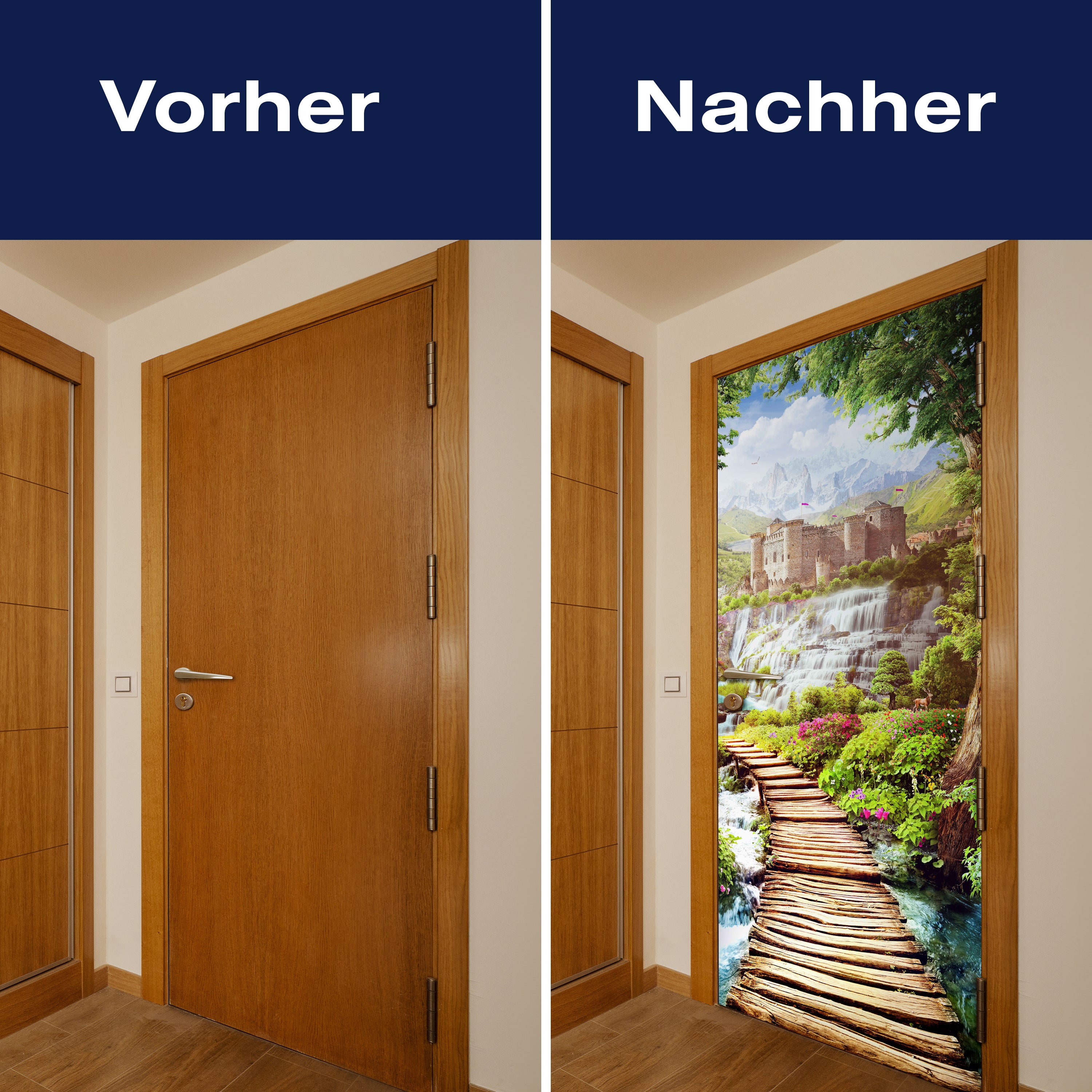 Hast du jemals darüber nachgedacht, wie eine einfache Veränderung deinen Wohnraum komplett umgestalten kann? Die Türtapete Burg in den Bergen, Gebirge, Holz-steg von Wandmotiv24 ist genau das, was du brauchst, um deinem Zuhause einen Hauch von Einzigartigkeit und Stil zu verleihen. Dieses einzigartige Design erzielt eine atemberaubende visuelle Wirkung, die jeden Betrachter in den Bann zieht.