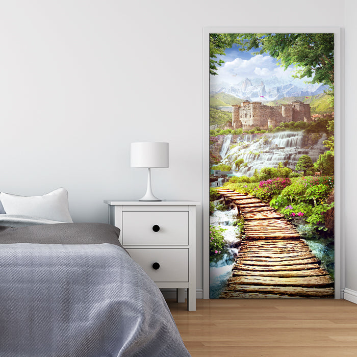 Entdecke die Türtapete Burg in den Bergen, Gebirge, Holz-steg