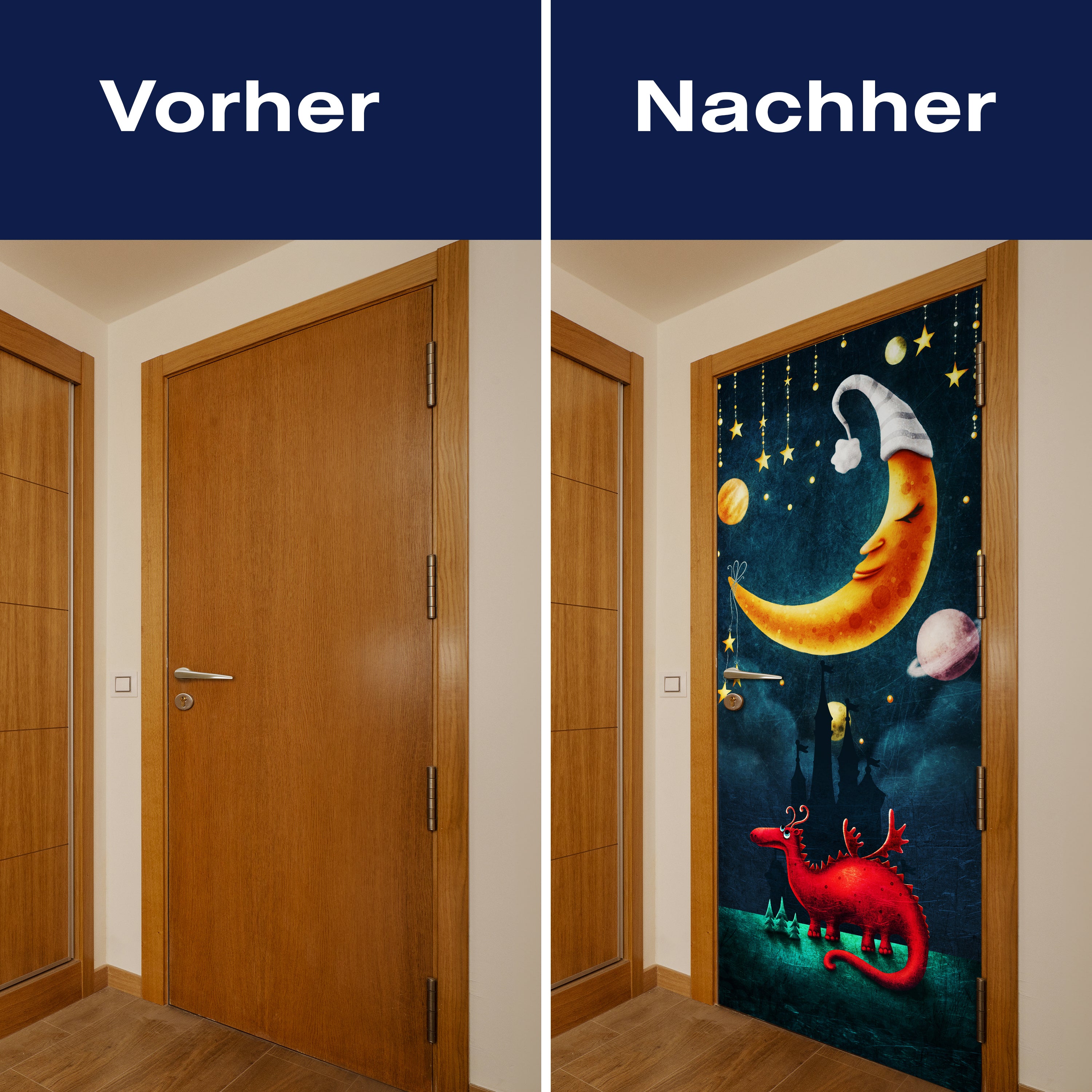 Hast du jemals darüber nachgedacht, wie eine einfache Veränderung deinen Wohnraum komplett umgestalten kann? Die Türtapete Drache, Mond, Sterne von Wandmotiv24 ist genau das, was du brauchst, um deinem Zuhause einen Hauch von Einzigartigkeit und Stil zu verleihen. Dieses einzigartige Design erzielt eine atemberaubende visuelle Wirkung, die jeden Betrachter in den Bann zieht.