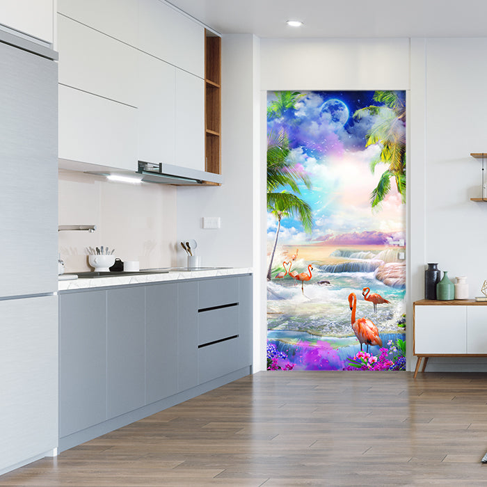 Entdecke die Türtapete Flamingos am Meer, Lila Wolken, Mond