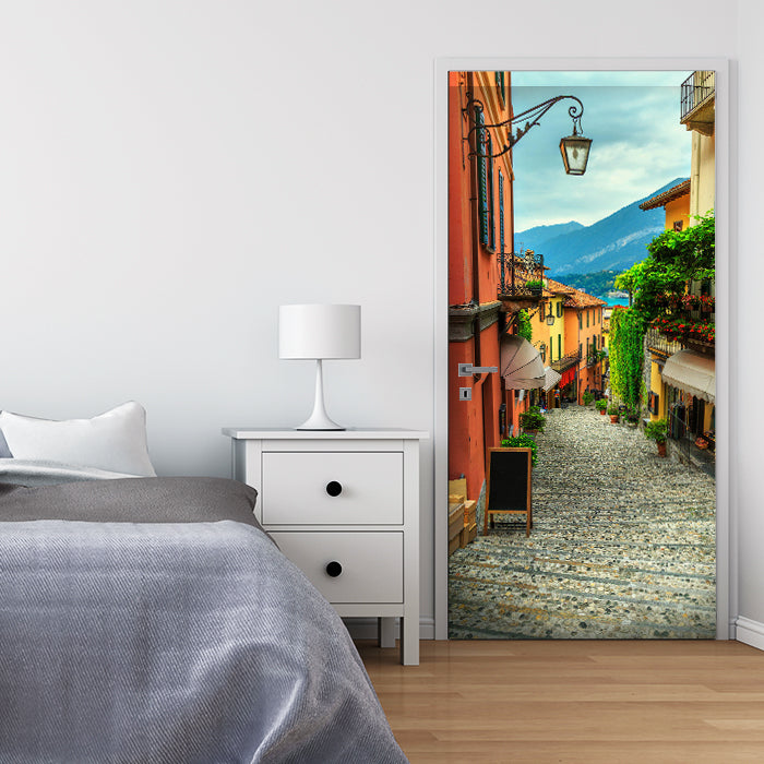Entdecke die Türtapete Gasse mit Blick auf Berge & See, Italien