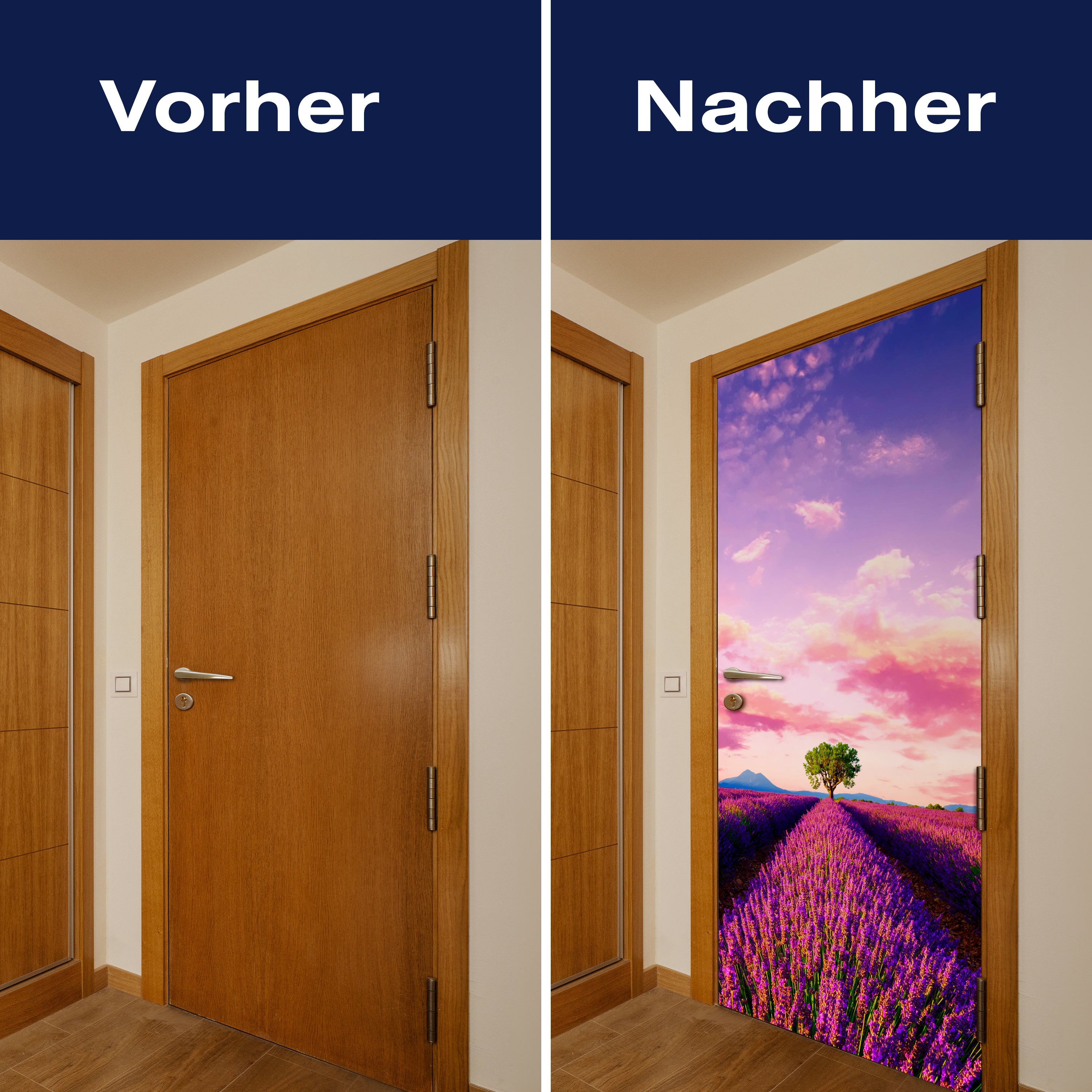 Hast du jemals darüber nachgedacht, wie eine einfache Veränderung deinen Wohnraum komplett umgestalten kann? Die Türtapete Lavendel, Feld, Baum, Landschaft von Wandmotiv24 ist genau das, was du brauchst, um deinem Zuhause einen Hauch von Einzigartigkeit und Stil zu verleihen. Dieses einzigartige Design erzielt eine atemberaubende visuelle Wirkung, die jeden Betrachter in den Bann zieht.