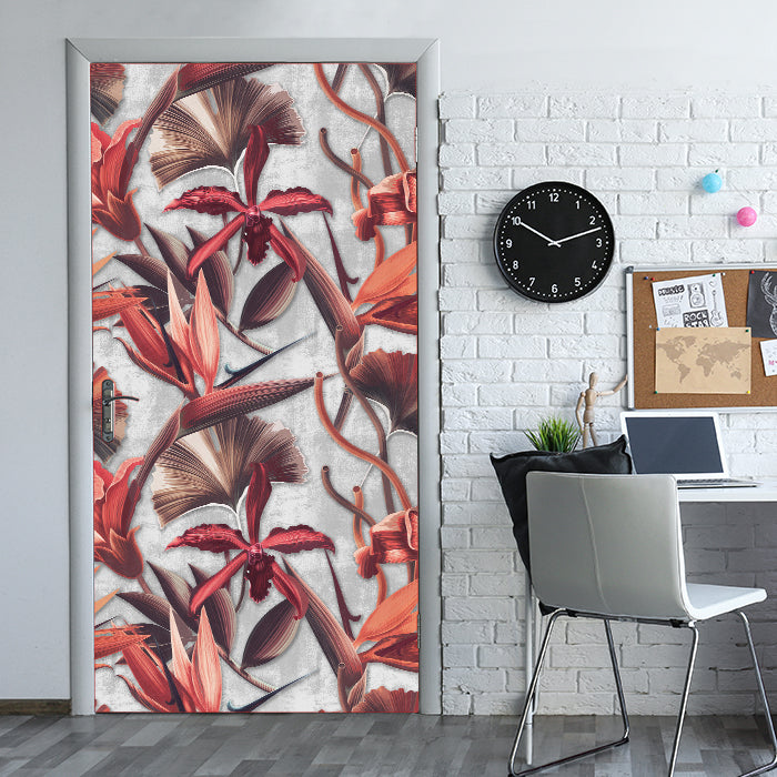 Entdecke die Türtapete Rote Blüten & Blätter, Pflanzen, Beton
