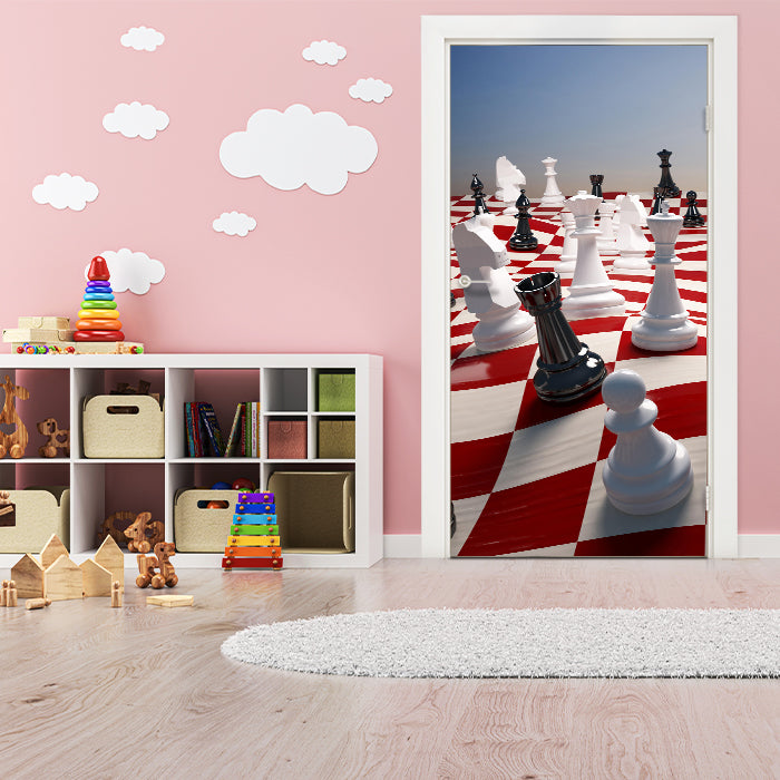 Entdecke die Türtapete Schach auf einem winkenden Schachfeld