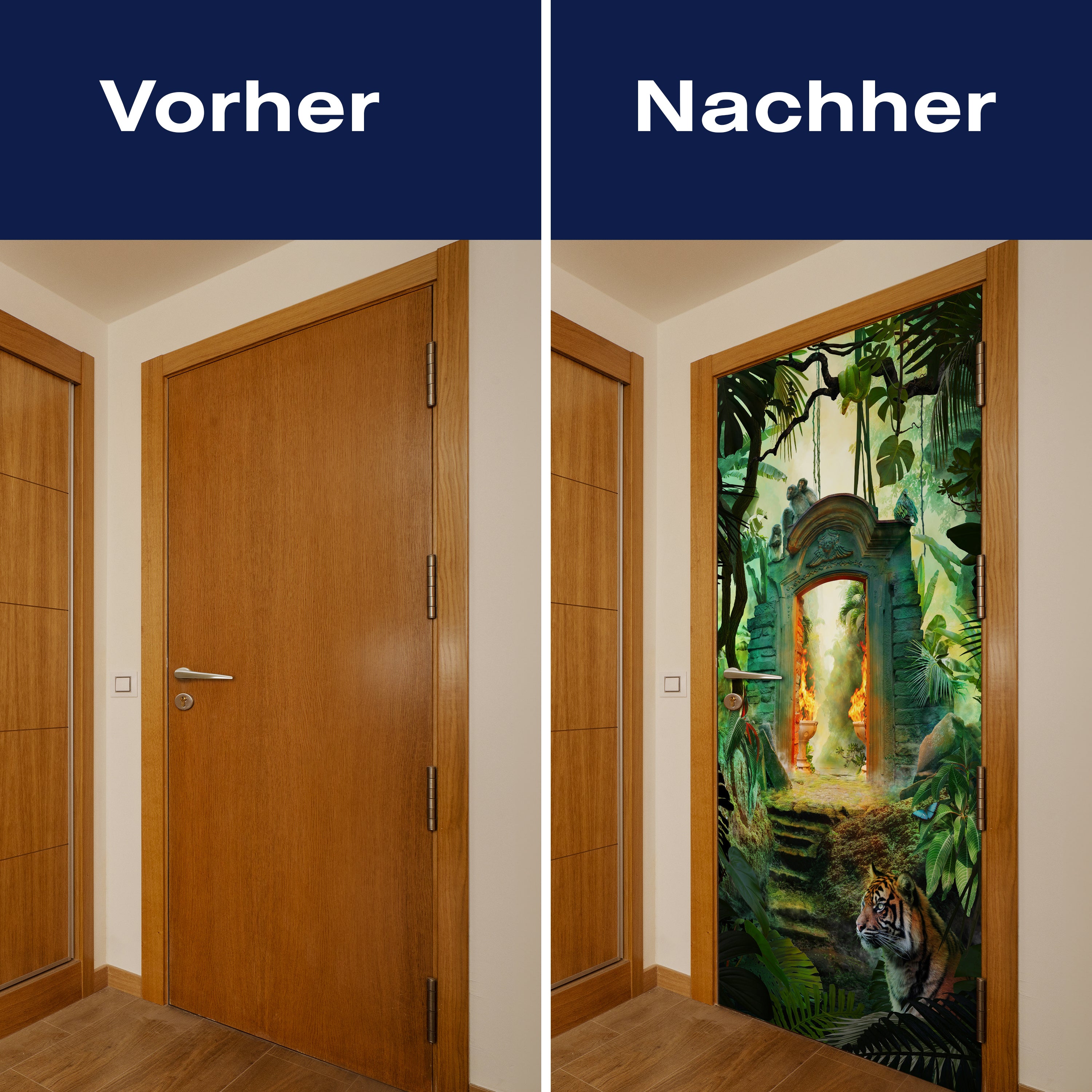 Hast du jemals darüber nachgedacht, wie eine einfache Veränderung deinen Wohnraum komplett umgestalten kann? Die Türtapete Steintor im Dschungel, Feuer, Tiger von Wandmotiv24 ist genau das, was du brauchst, um deinem Zuhause einen Hauch von Einzigartigkeit und Stil zu verleihen. Dieses einzigartige Design erzielt eine atemberaubende visuelle Wirkung, die jeden Betrachter in den Bann zieht.
