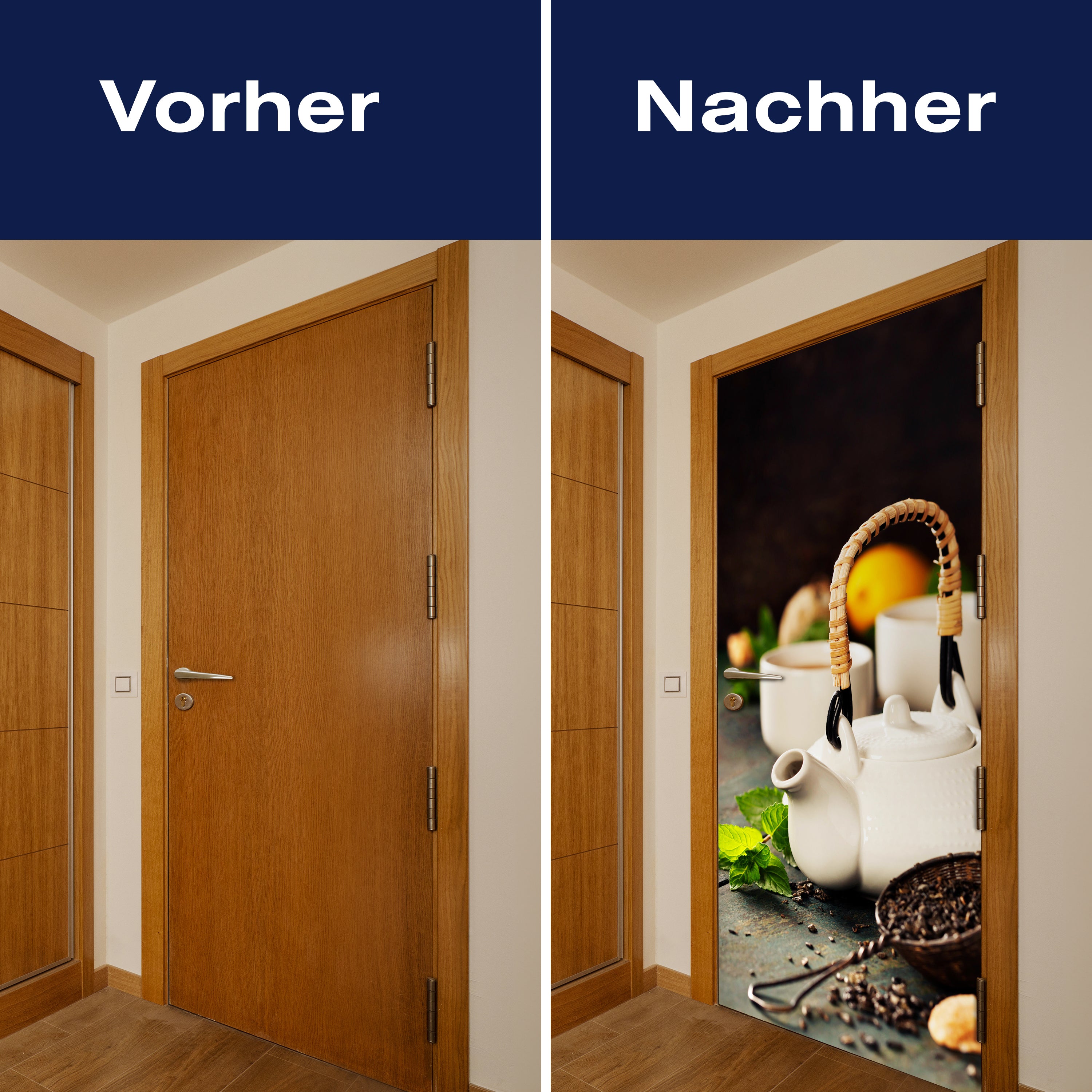 Hast du jemals darüber nachgedacht, wie eine einfache Veränderung deinen Wohnraum komplett umgestalten kann? Die Türtapete Teekanne und Tasse Tee mit Minze von Wandmotiv24 ist genau das, was du brauchst, um deinem Zuhause einen Hauch von Einzigartigkeit und Stil zu verleihen. Dieses einzigartige Design erzielt eine atemberaubende visuelle Wirkung, die jeden Betrachter in den Bann zieht.