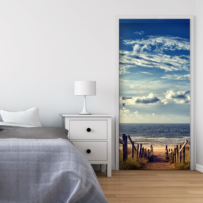 Entdecke die Türtapete Treppe ans Meer, Holz, Himmel, Wolken