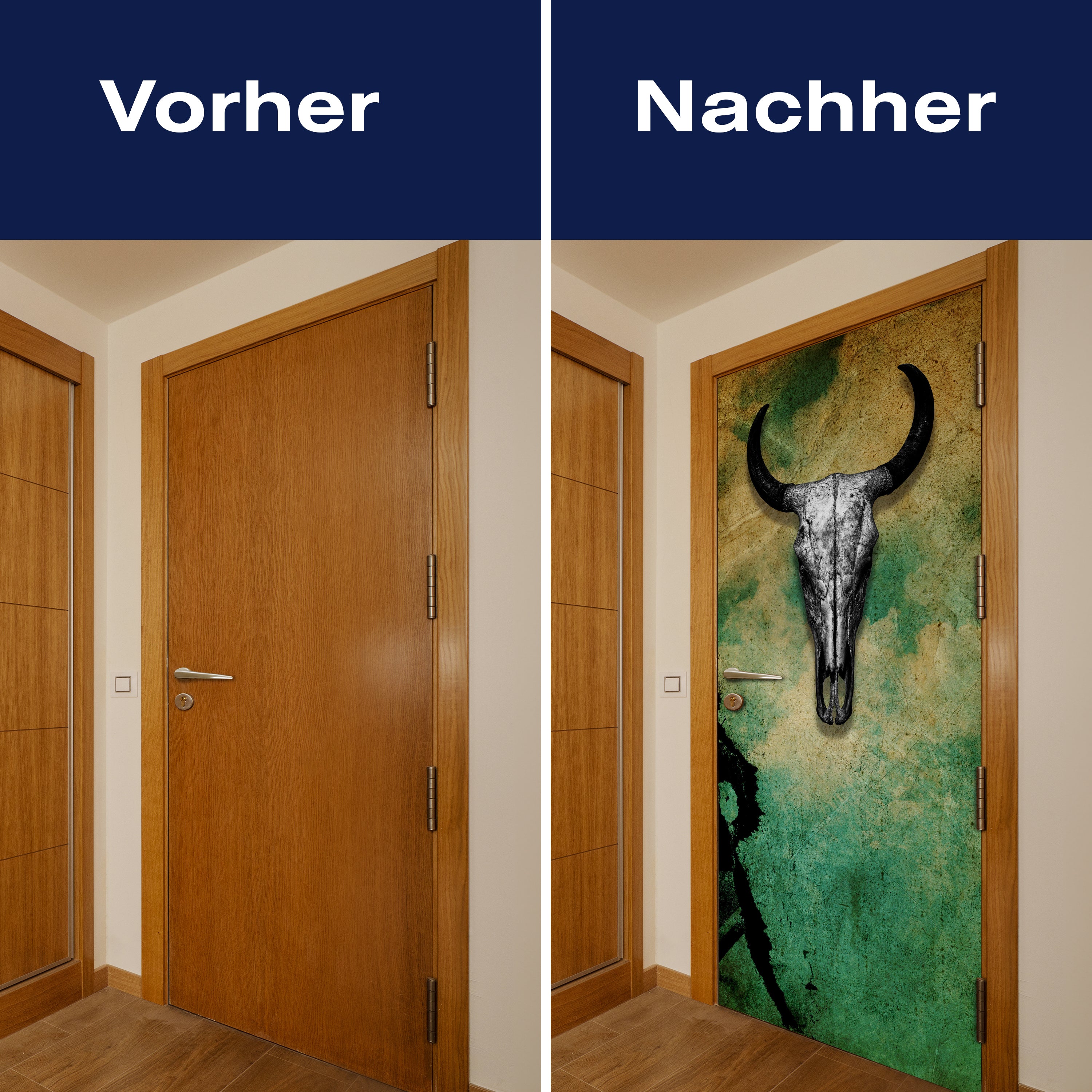Hast du jemals darüber nachgedacht, wie eine einfache Veränderung deinen Wohnraum komplett umgestalten kann? Die Türtapete Kuh, Totenkopf, Schädel, Western von Wandmotiv24 ist genau das, was du brauchst, um deinem Zuhause einen Hauch von Einzigartigkeit und Stil zu verleihen. Dieses einzigartige Design erzielt eine atemberaubende visuelle Wirkung, die jeden Betrachter in den Bann zieht.