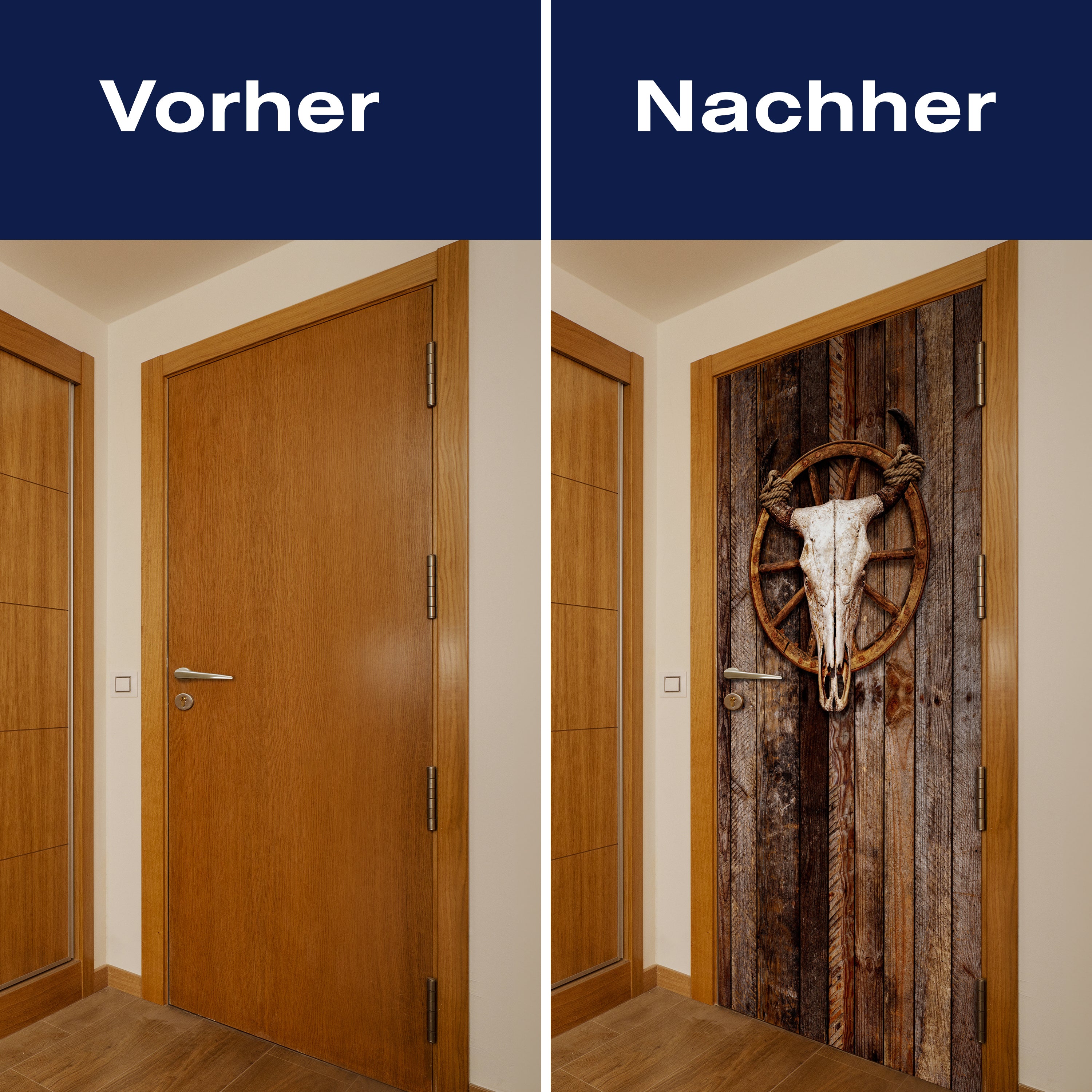 Hast du jemals darüber nachgedacht, wie eine einfache Veränderung deinen Wohnraum komplett umgestalten kann? Die Türtapete Kuh, Totenkopf, Holz, Schädel, Western von Wandmotiv24 ist genau das, was du brauchst, um deinem Zuhause einen Hauch von Einzigartigkeit und Stil zu verleihen. Dieses einzigartige Design erzielt eine atemberaubende visuelle Wirkung, die jeden Betrachter in den Bann zieht.